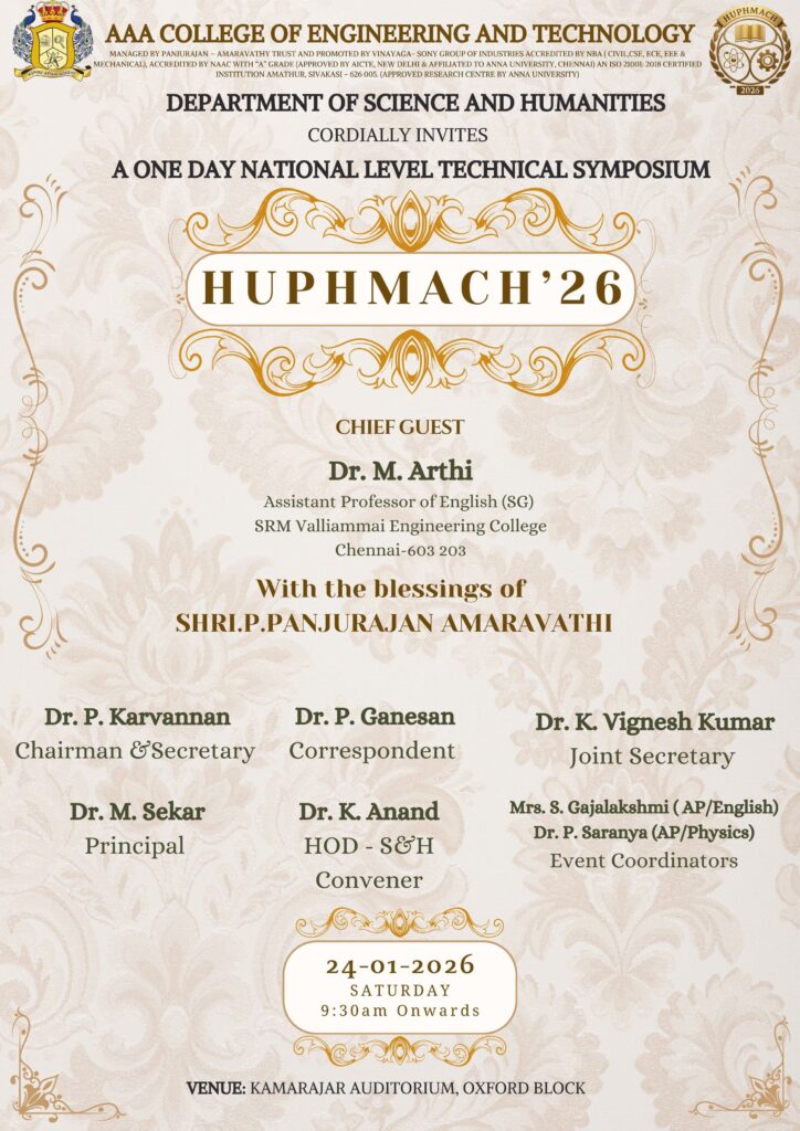 AAA College of Engineering and Technology confronts to produce smart professionals with humanity ethics. At its budding stage, it offers 5 undergraduate courses.B.E.,(Bachelor of Engineering)