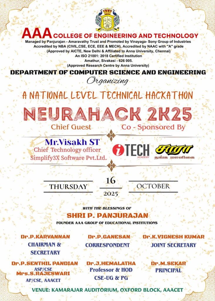 The Department of Computer Science and Engineering of AAA College of Engineering and Technology successfully organized NEURAHACK 2K25, a National Level Technical Hackathon, on October 16, 2025. The event aimed to bring together passionate and innovative students from across the country to collaborate, ideate, and develop advanced technology-driven solutions for real-world challenges.