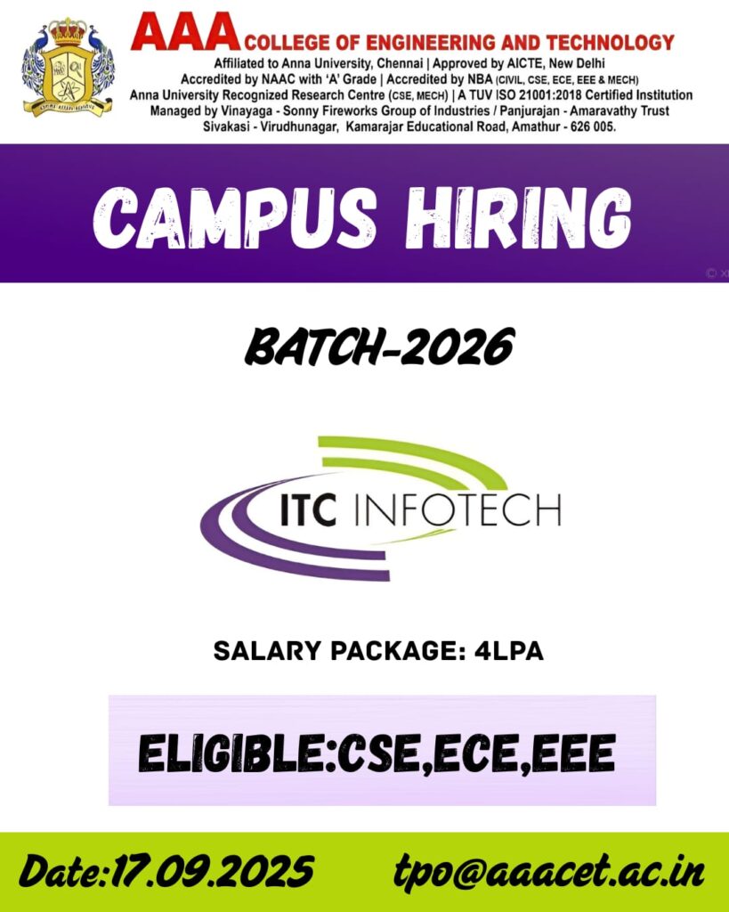 AAA College of Engineering and Technology is pleased to announce that ITC Infotech will be visiting our campus for a recruitment drive for the 2026 graduating batch. This placement opportunity is open to students from the CSE, ECE, and EEE departments, with an attractive salary package of 4 LPA. The drive is scheduled for 17th September 2025. As part of the pre-placement preparation, our Training and Placement Cell has designed comprehensive training sessions to equip students with the necessary skills. These sessions cover aptitude and logical reasoning practice, technical knowledge enhancement, and intensive coding training to strengthen problem-solving abilities. Students will also undergo mock placement tests, group discussion practice, and soft skills development workshopsto improve their confidence, communication, and teamwork skills. Additional focus will be given to resume building, interview handling techniques, and industry awareness sessions that highlight the latest IT trends and company-specific expectations. Through mock HR and technical interviews, students will receive personalized feedback to refine their performance. Special guidance will also be provided on academic project presentations, professional etiquette, and career growth opportunities in ITC Infotech. These structured training programs are aimed at ensuring our students are well-prepared, industry-ready, and confident to excel in the recruitment process and secure rewarding careers with ITC Infotech.