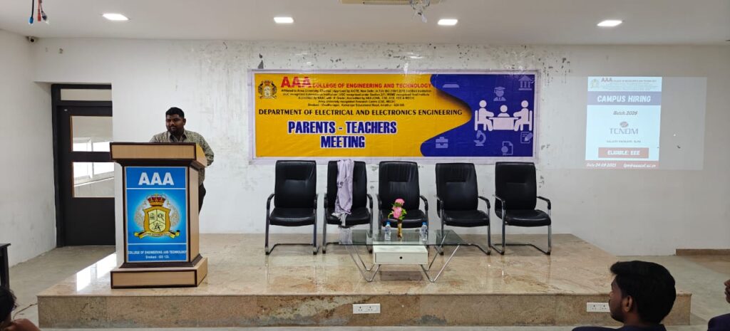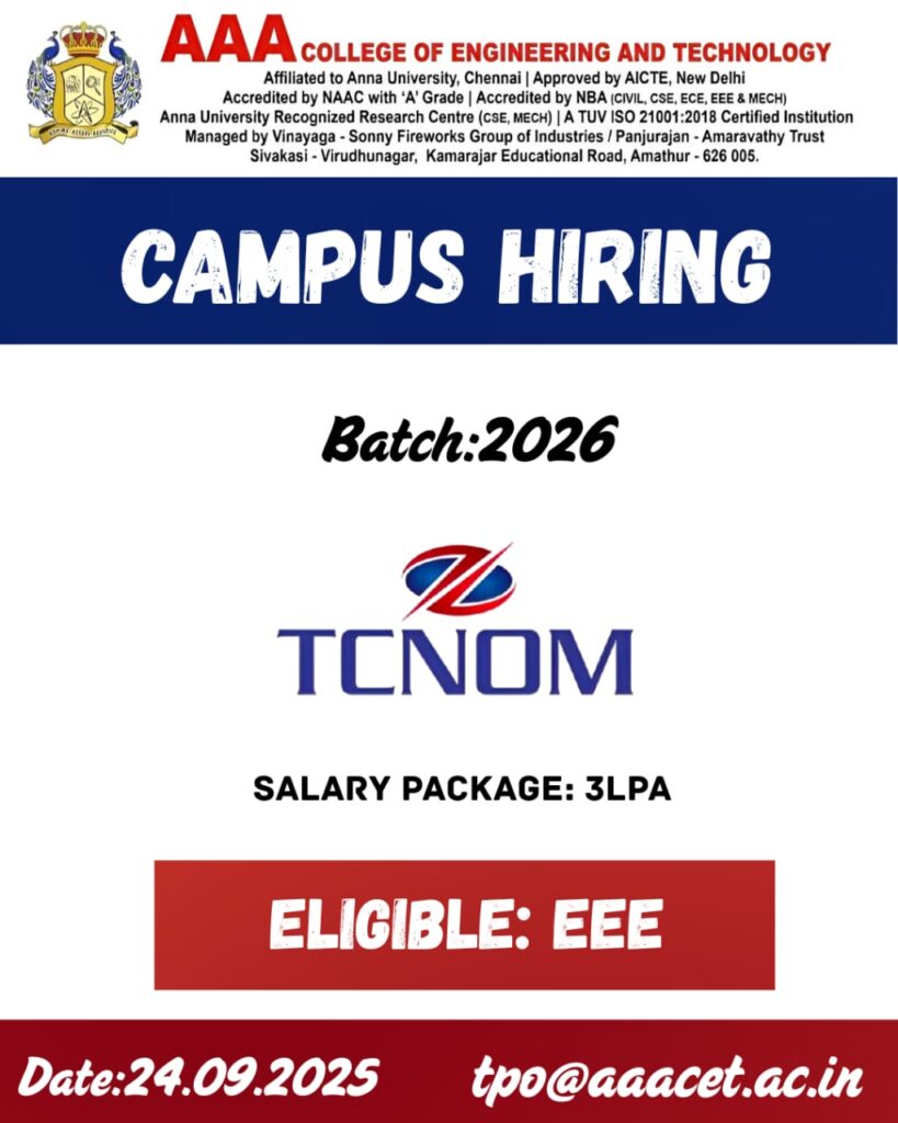 AAA College of Engineering and Technology is proud to announce that TCNOM will be conducting a campus recruitment drive for the 2026 graduating batch on 24th September 2025. This exclusive opportunity is open to students from the EEE department, with a competitive salary package of 3 LPA. As part of the preparation, our Training and Placement Cell has arranged focused training sessions that include aptitude practice, technical workshops, and mock interviews to help students perform confidently during the drive. The training emphasizes core Electrical and Electronics Engineering concepts, problem-solving techniques, and practical applications relevant to the industry. In addition, sessions on resume building, communication skills, and group discussions are being organized to enhance student readiness. Students are also encouraged to strengthen their knowledge in areas such as circuit analysis, power systems, control systems, and electrical machines, which are vital for technical interviews. The placement drive will follow a multi-round selection process including aptitude tests, technical assessments, and HR interviews. This is a valuable opportunity for students to start their careers with a reputed company and gain real-world exposure in their domain. We strongly encourage all eligible students to actively participate, prepare thoroughly, and make the best use of this placement opportunity.