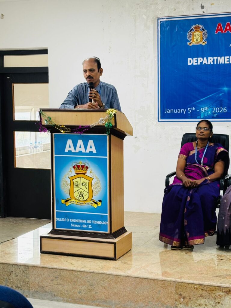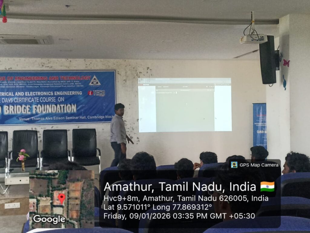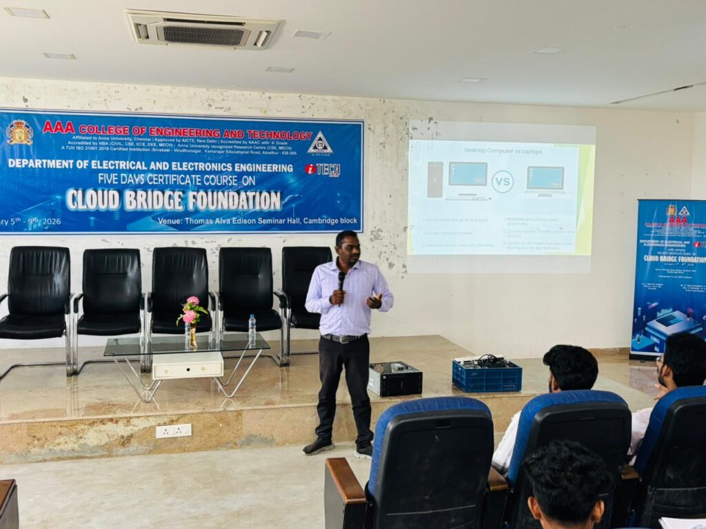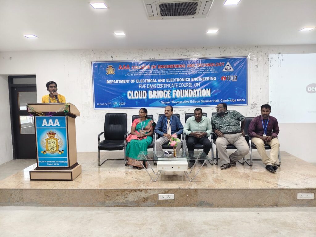 The Department of Electrical and Electronics Engineering, AAA College of Engineering and Technology, Sivakasi, in association with iTech Academy, jointly organized a Five Days Certificate Course on “Cloud Bridge Foundation” for the IV Year EEE students. The program was conducted from 5th January 2026 to 9th January 2026 at Thomas Alva Edison Seminar Hall, Cambridge Block, with the objective of providing fundamental knowledge and practical exposure to cloud computing technologies.