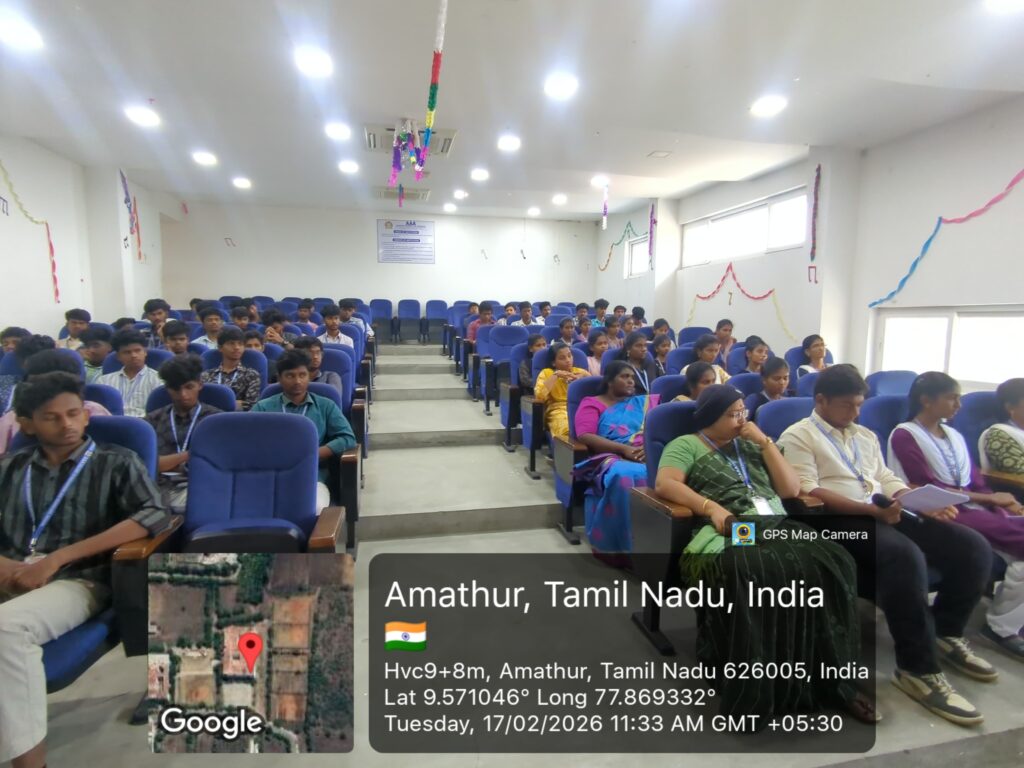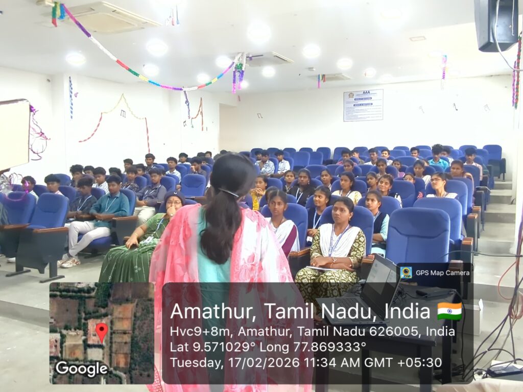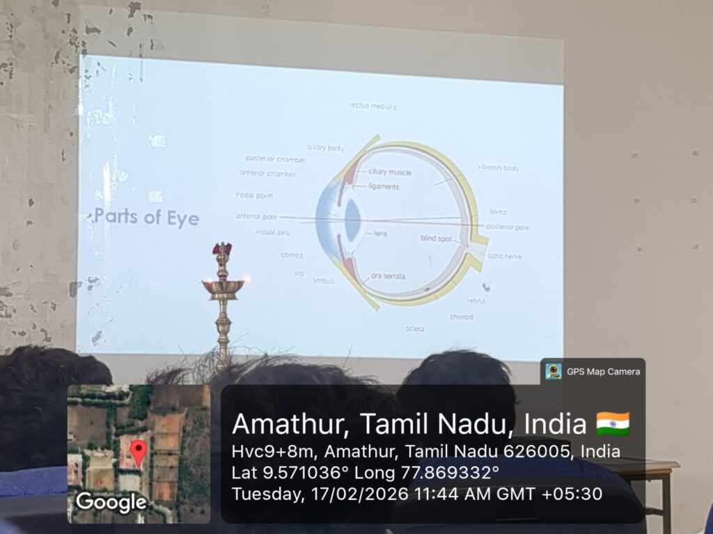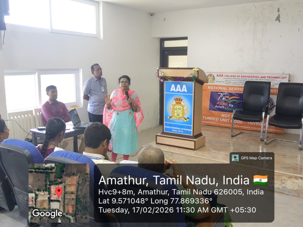 Women Empowerment Cell & NSS, AAA College of Engineering & Technology, organized an Eye Screening Training Program on 17 Feb 2026. Dr. Sahithya Bhaskaran delivered a session on eye health awareness & basic screening techniques. 100 students participated & gained hands-on experience in eye screening.