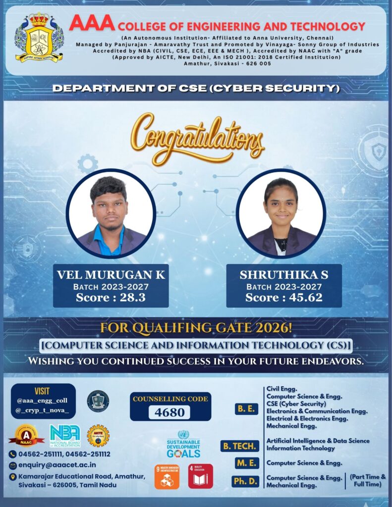 AAA College of Engineering and Technology, along with the Department of Computer Science and Engineering (Cyber Security), extends its heartfelt congratulations to Mr. Vel Murugan K and Ms. Shruthika S (Batch 2023–2027) for successfully qualifying GATE 2026 in Computer Science and Information Technology (CS).