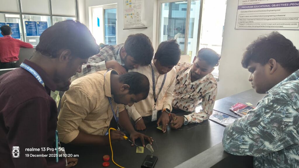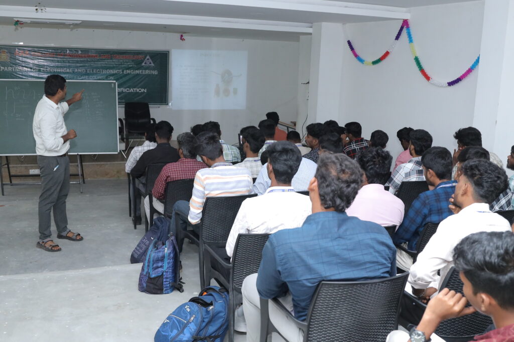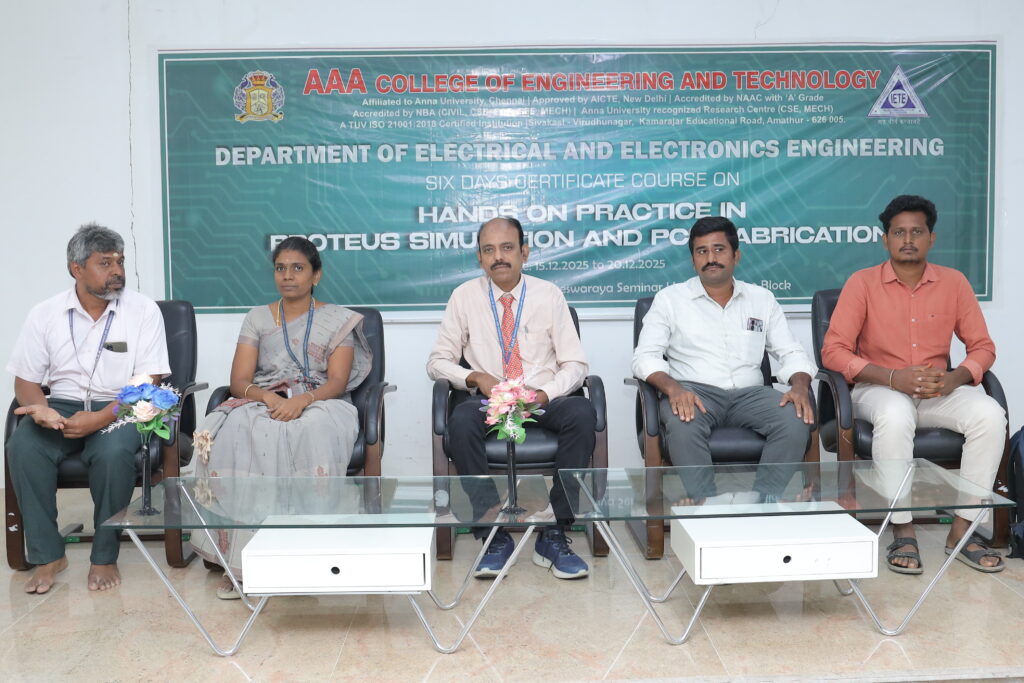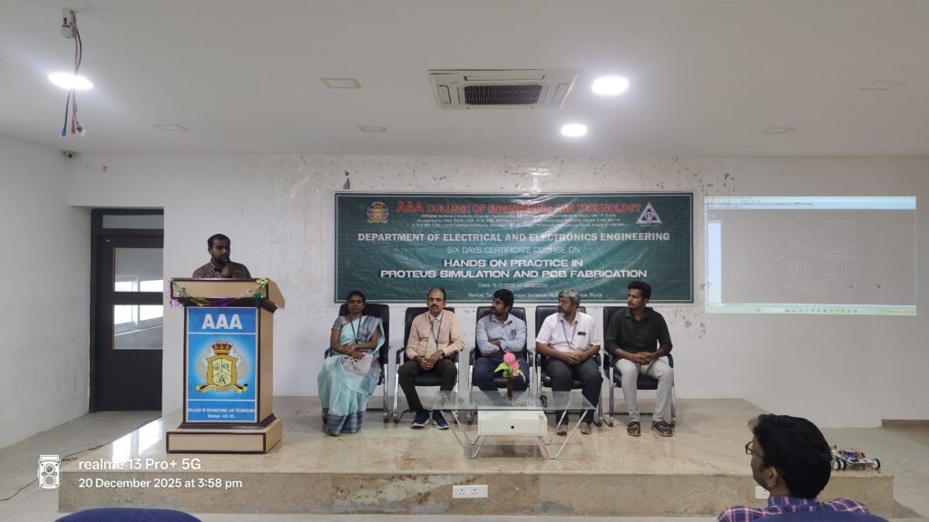 The Department of Electrical and Electronics Engineering successfully conducted a six-day Certificate Course titled “Hands-on Practice in Proteus Simulation and PCB Fabrication” from 15.12.2025 to 20.12.2025 for the Second Year EEE students. The course was handled by Dr. N. Pothirasan, Proprietor of Hasha Medicare, Rajapalayam, who served as the resource person. The course was inaugurated by the Head of the Department, Prof. Dr. C. Senthil Kumar, who emphasized the importance of understanding electronics hardware fundamentals. He highlighted that PCB designing is an essential skill and an art, and stressed that every budding electrical engineer must acquire hands-on knowledge in designing and fabricating electronic circuits to meet industry expectations.