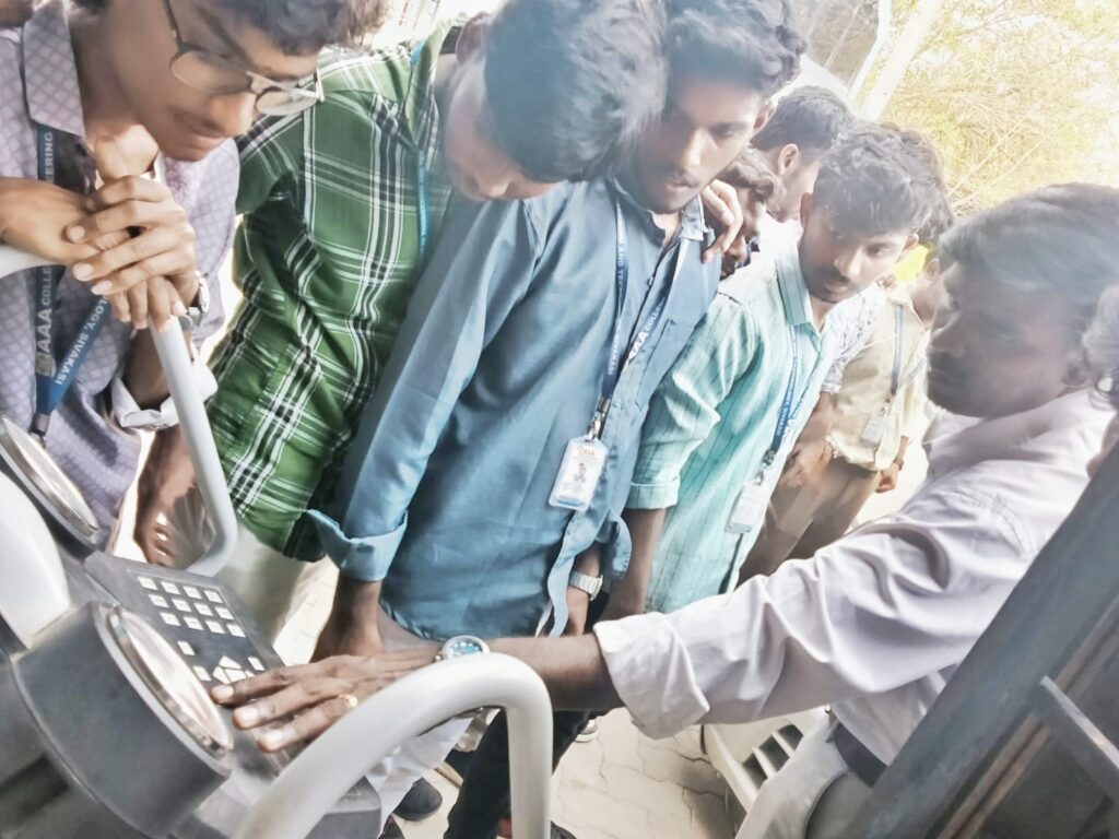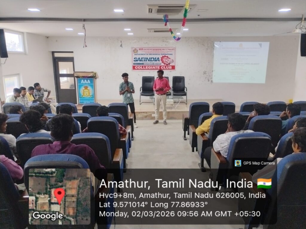 The Department of Mechanical Engineering, AAA College of Engineering and Technology, Sivakasi, in association with the SAE INDIA Collegiate Club, organized a three-day Hands-on Training Program on Car AC & Wheel Balancer for Mechanical Engineering students from 27.02.2026 , 28.02.2026 & 02.03.2026 at Thomas Alva Edison Hall, AAA College of Engineering and Technology.