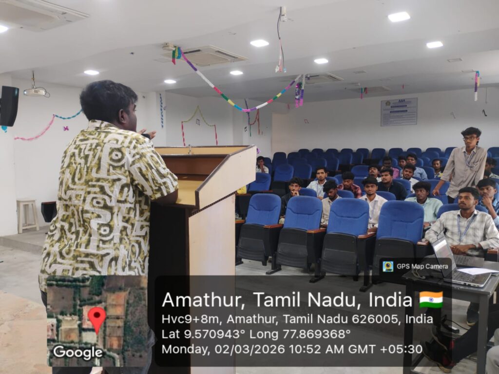 On Day 2 (28.02.2026), the session was conducted by Mr. M. Nagendran, Assistant Professor, Department of Mechanical Engineering. The session focused on Wheel Balancer technology. He explained the importance of wheel balancing in automobiles, the types of wheel imbalance such as static imbalance and dynamic imbalance, and their effects on vehicle stability, tyre wear, steering control, and overall vehicle performance. Students also gained insights into the working principle and operation of wheel balancing equipment used in automobile service centers.