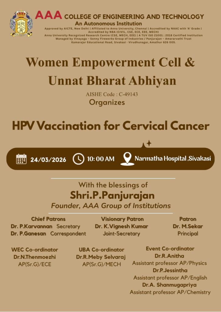 The Women Empowerment Cell (WEC), in association with Unnat Bharat Abhiyan (UBA) of AAA College of Engineering and Technology, Sivakasi, successfully organized a *“HPV Vaccination for Cervical Cancer”* program for First year girl students on *24th March 2026* at *Narmatha* *Hospital* , *Sivakasi* .