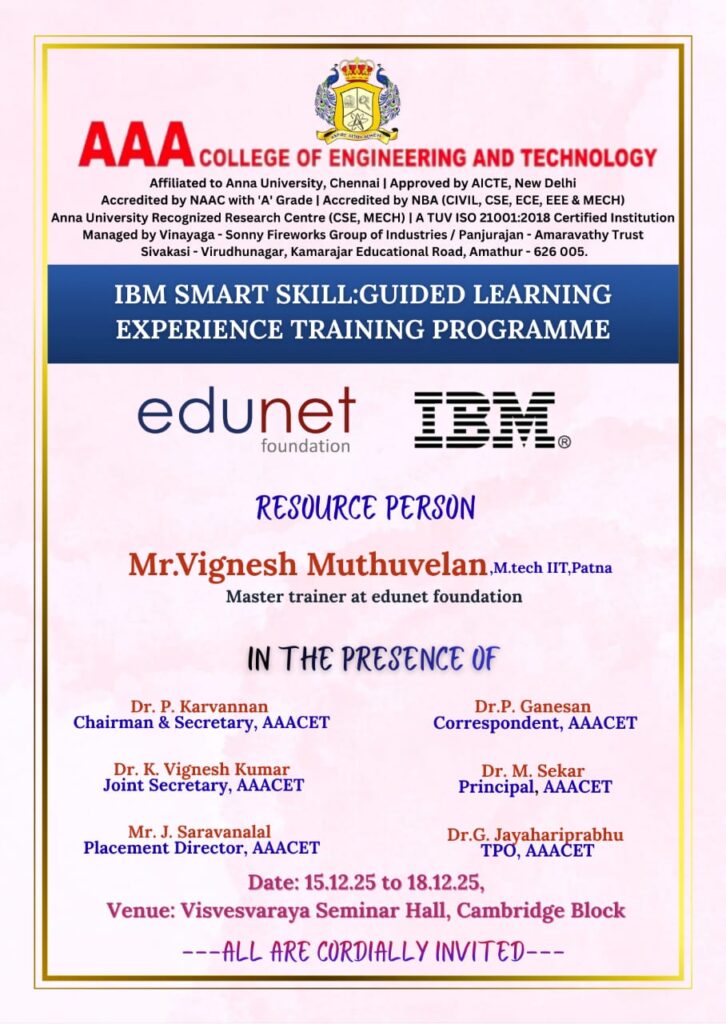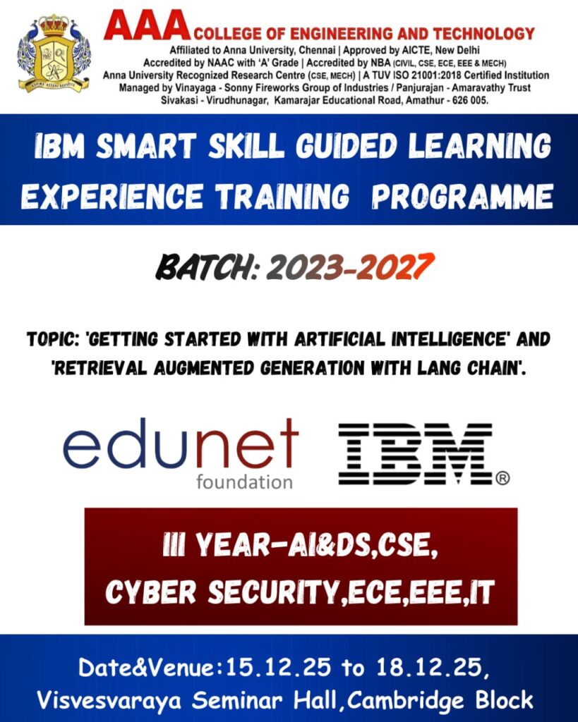 AAA College of Engineering and Technology successfully organized the IBM Smart Skill Guided Learning Experience Training Programme in association with IBM and Edunet Foundation from 15th December 2025 to 18th December 2025 at the Visvesvaraya Seminar Hall, Cambridge Block. The programme was conducted with the objective of equipping students with industry-relevant knowledge and hands-on exposure to emerging technologies, thereby bridging the gap between academic learning and real-world industry expectations. The training programme was designed for III year students of AI & DS, Computer Science Engineering, Cyber Security, Electronics and Communication Engineering, Electrical and Electronics Engineering, and Information Technology (Batch 2023–2027). The sessions focused on building a strong foundation in Artificial Intelligence, with special emphasis on modern concepts such as Retrieval Augmented Generation (RAG) and LangChain, which are widely used in current AI-driven applications.