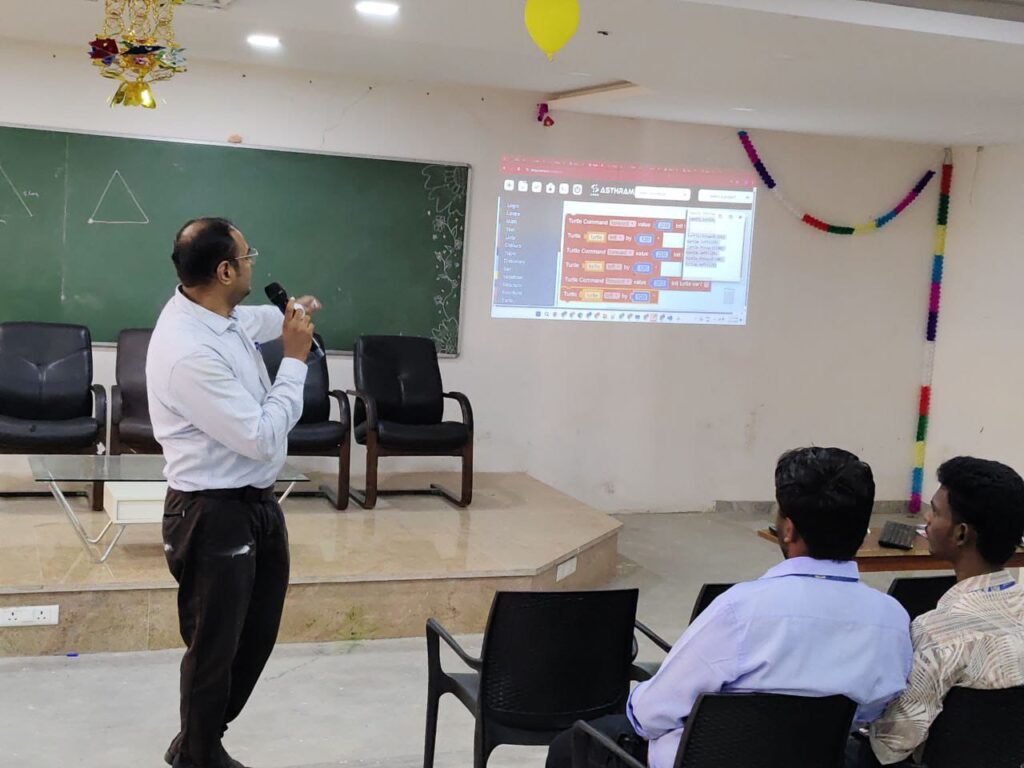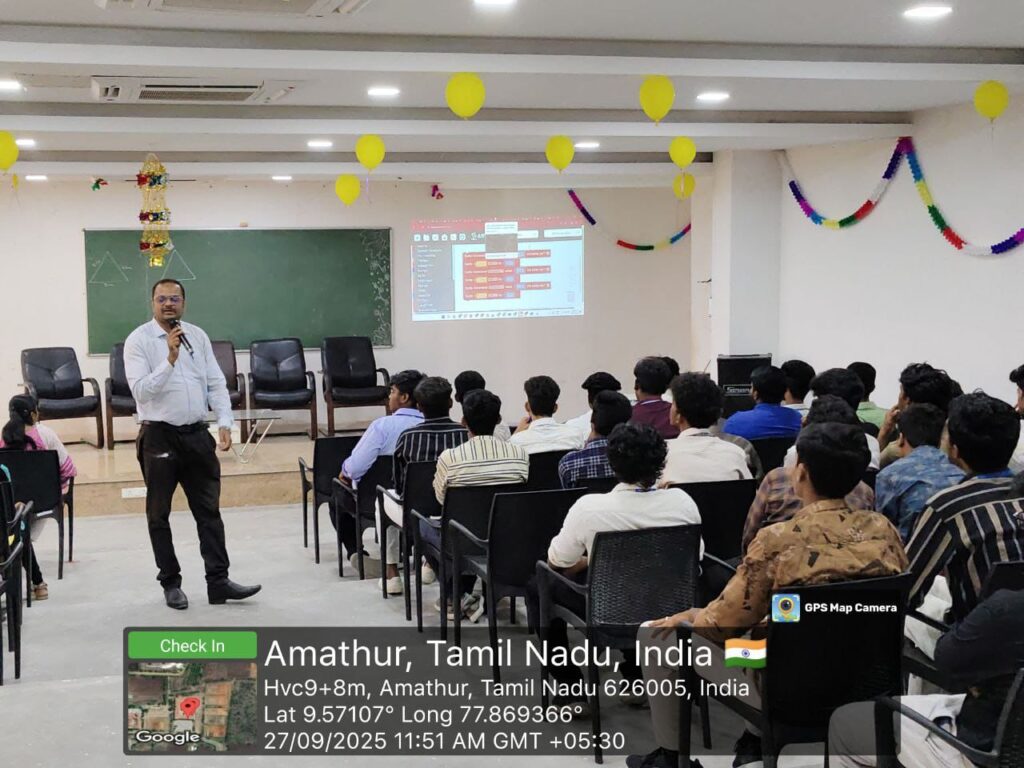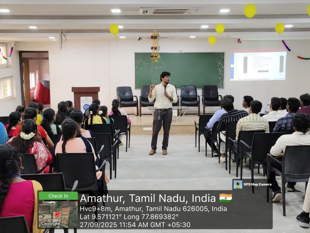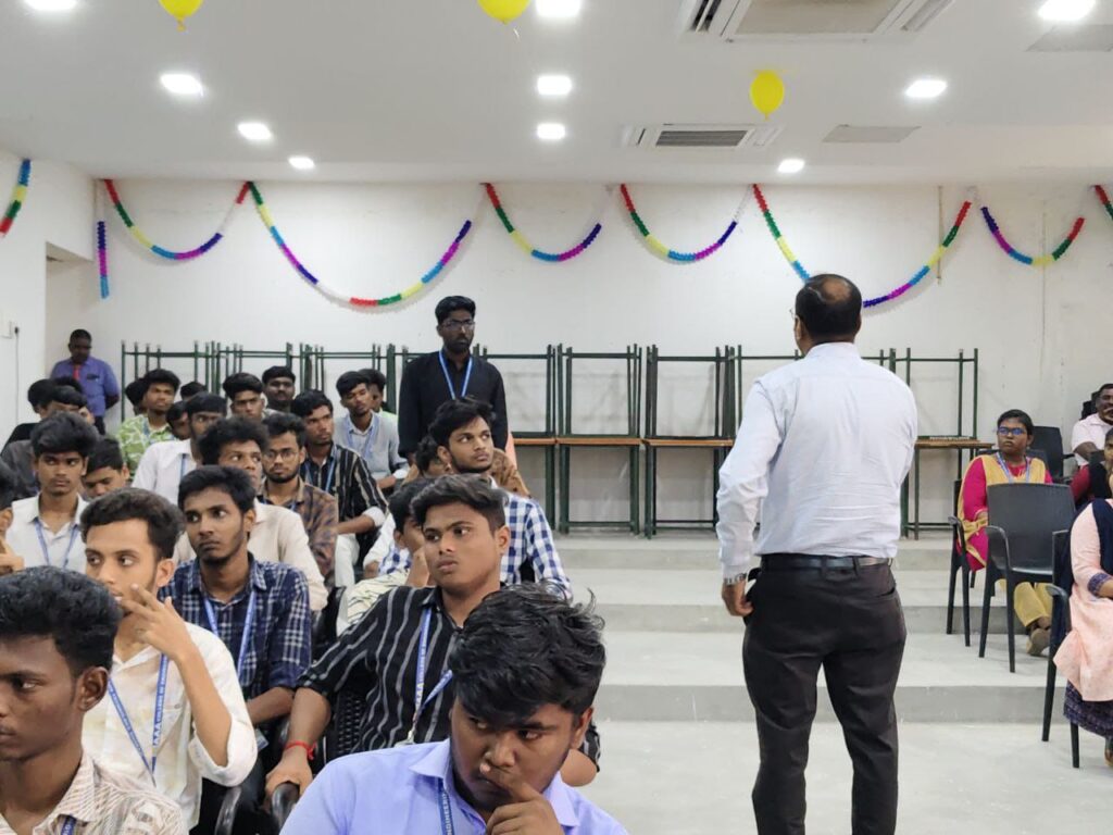 The second session was led by Mr. Mohamed Arshath, Chief Architect, who guided the students on how to approach a hackathon step by step. Starting from the basics, he explained the methods to participate effectively and how to proceed to the next level. His talk motivated the students to take part in the upcoming hackathon with confidence and enthusiasm. The sessions were not only informative but also highly engaging, sparking curiosity and enthusiasm among participants. By shedding light on real-world applications of Python, the importance of algorithms, and the strategic approach to hackathons.