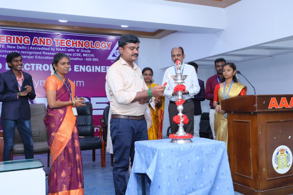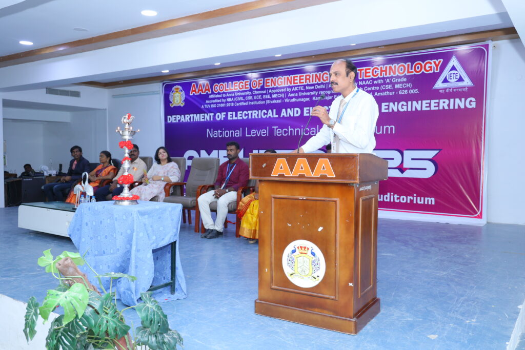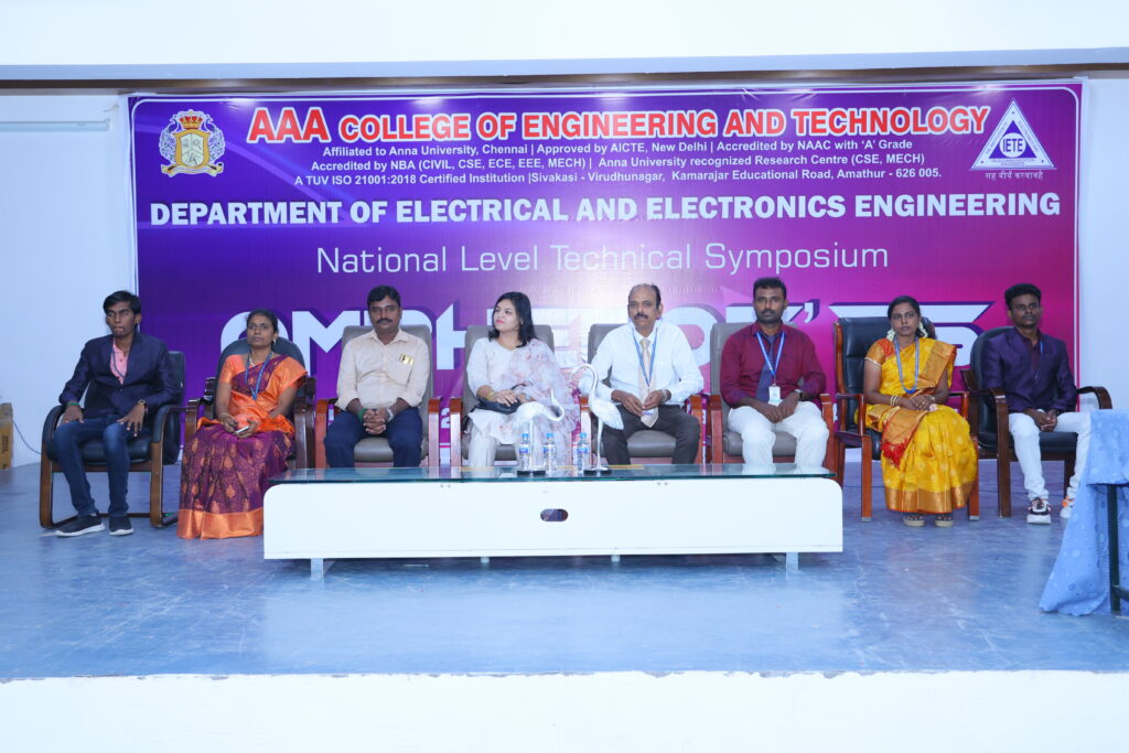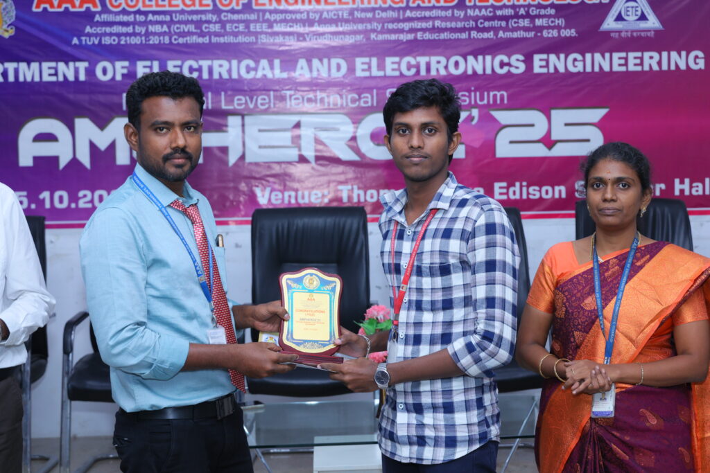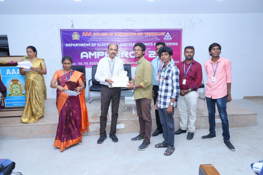 The Department of Electrical and Electronics Engineering of AAA College of Engineering and Technology, Sivakasi, organized a National Level Technical Symposium titled “AMPHEROZ’25” on 15th October 2025 at Kamarajar Auditorium. The symposium aimed to enhance students’ technical knowledge and provide a common platform to showcase their innovative ideas and creativity in the field of Electrical and Electronics Engineering. The event began with the registration at 9.15 a.m., followed by a prayer song and the lighting of the kuthuvilakku, marking an auspicious start to the program. Ms. R. Nithyalakshmi (IV Year EEE) delivered the Welcome Address, warmly greeting the dignitaries, faculty members, and participants from various institutions. Dr. C. Senthil Kumar, Professor and Head of the Department of EEE, delivered the Inaugural Address, motivating students to explore new technological advancements and emphasizing the importance of hands-on learning and research-oriented thinking in the engineering domain. During the inauguration, the Department Magazine and Newsletter were formally introduced by the Chief Guests, marking a proud moment for the Department of Electrical and Electronics Engineering as it showcased the achievements, innovations, and creative works of students and faculty members.