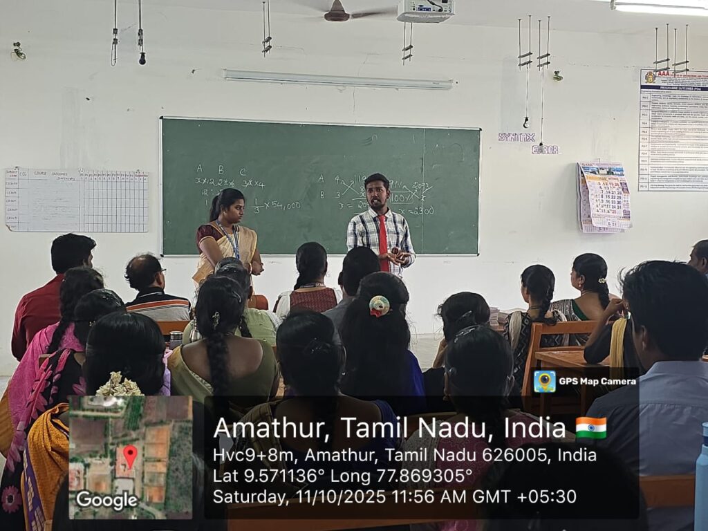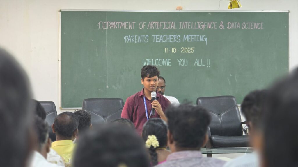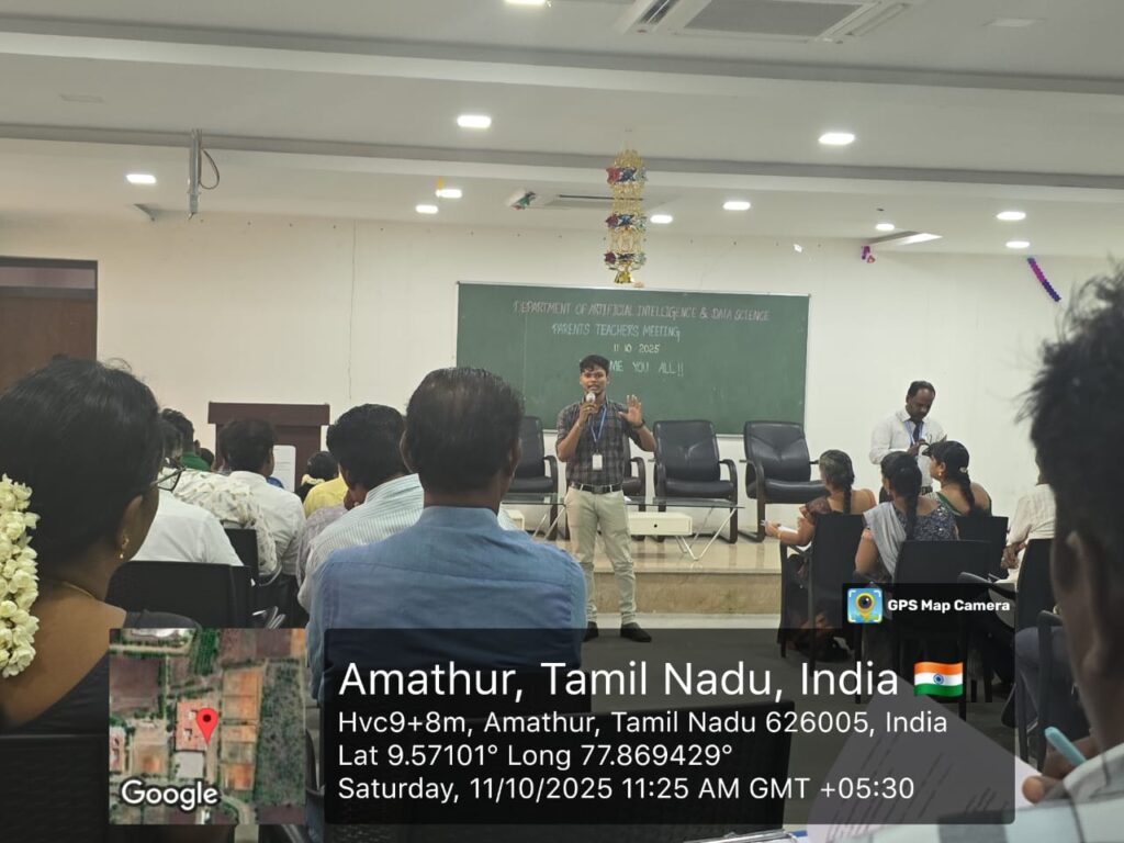 The Parent–Teacher Meeting for the Department of Artificial Intelligence and Data Science was conducted on 11th October 2025, in Sir C V Raman Hall, Cambridge Block, Third floor, at AAA College of Engineering and Technology, with the active participation of parents, faculty members, and students. This meeting was organised as a joint session for both II-Year and III-Year students, aiming to strengthen communication between parents and the department, as well as overall student development.