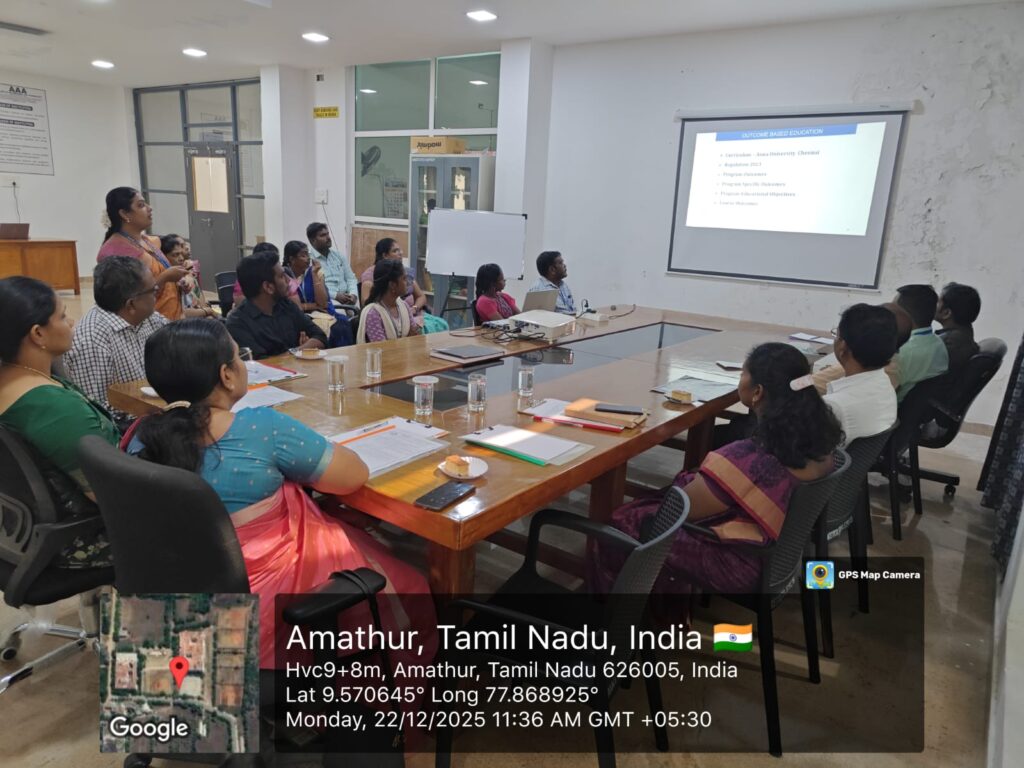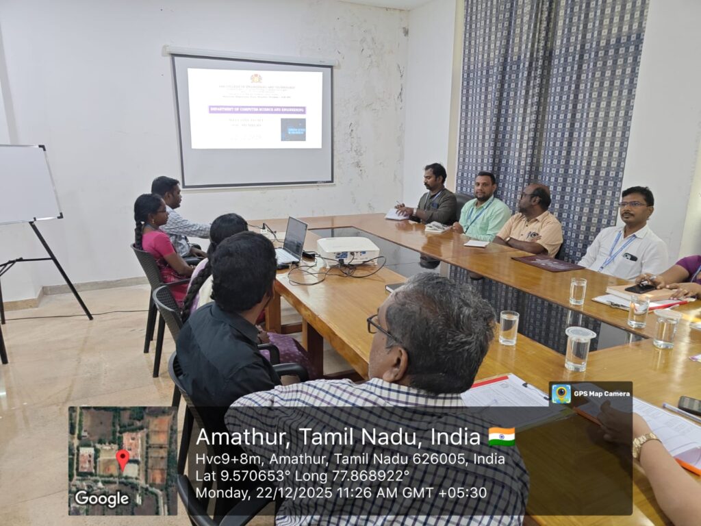 The Head of the Department presented a comprehensive overview of the department covering vision and mission, academic performance, faculty profile, infrastructure, student achievements, research activities, and placement performance. The implementation of Outcome Based Education (OBE), CO–PO–PSO mapping, and attainment analysis were discussed in detail. Teaching–learning practices such as mentoring, remedial classes, innovative pedagogical approaches, and the use of ICT tools were also highlighted. The action plan for the academic year 2025–26 was presented.