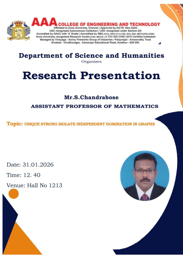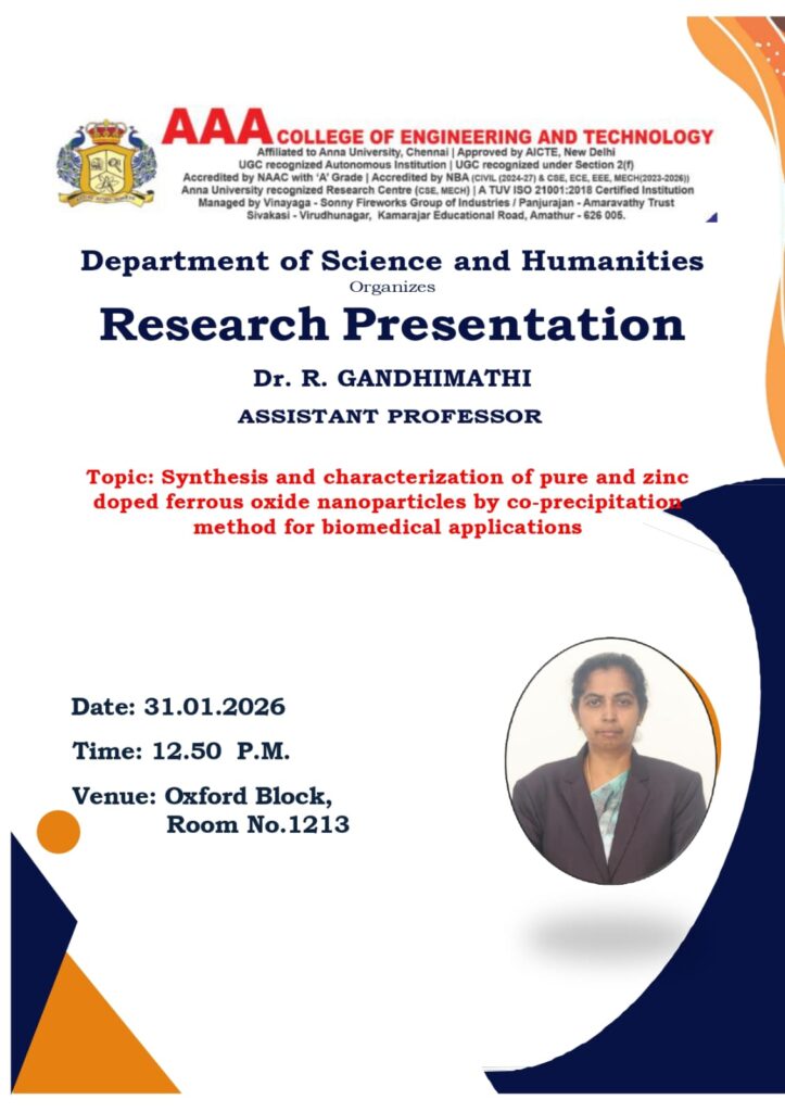 Research Presentations from Department of Science and Humanities by Dr. R. Gandhimathi/AP (Physics) and Mr. S. ChandraBose/AP(Maths)