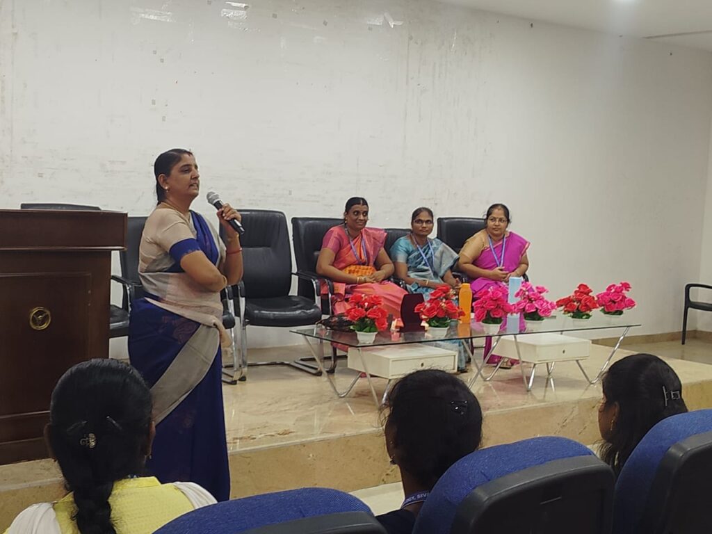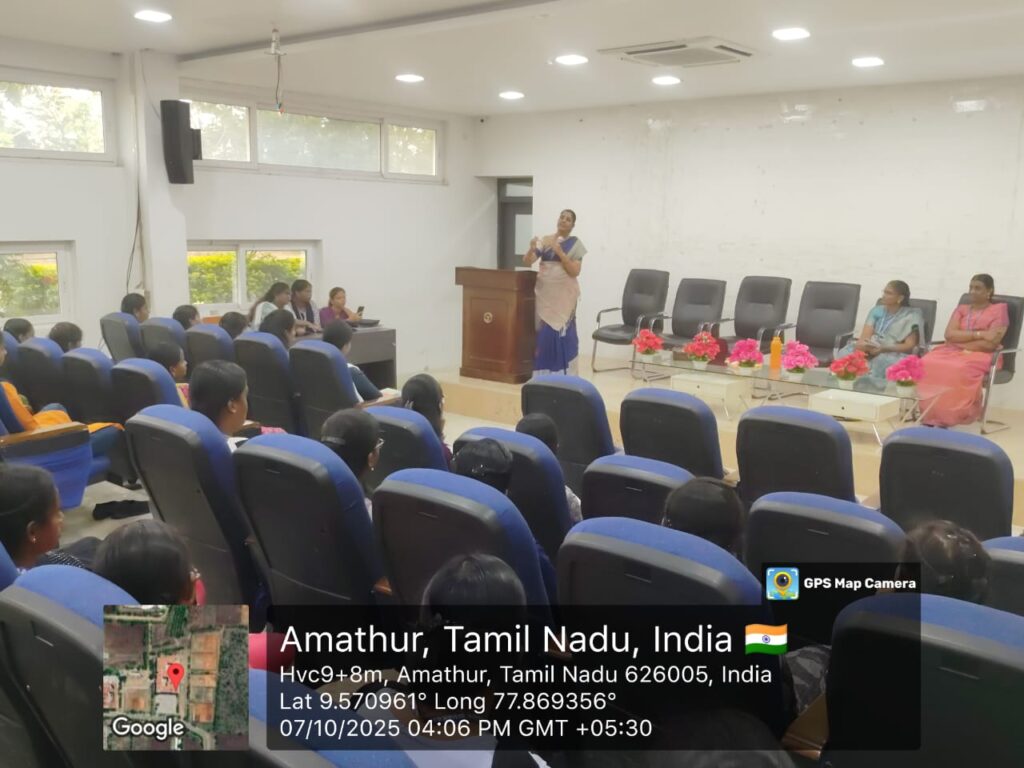 The resource person for the session was Mrs. S. Gomathy Priya, M.A., M.Phil., Development Officer, LIC Rajapalayam, who delivered a thought-provoking and motivating address. She spoke about entrepreneurship opportunities for young women, career prospects in various sectors of the Central Government, and emphasized the significance of women’s safety in public spaces and health awareness. She inspired the students to give importance to their health, follow a balanced lifestyle, and manage their time effectively by sharing useful and practical strategies